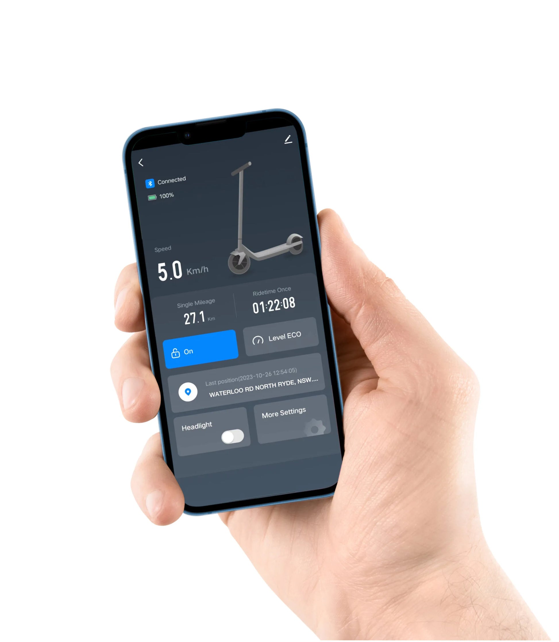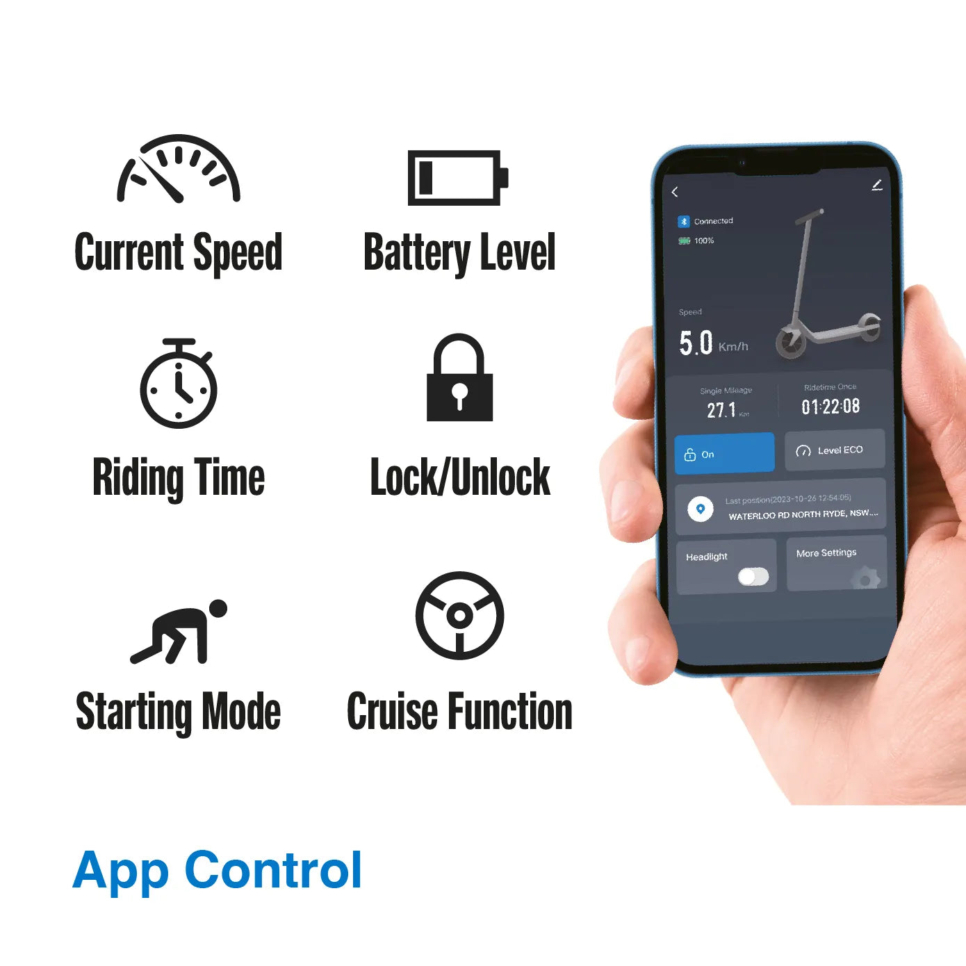 Easily monitor your speed, distance travelled, battery level, switch between starting modes, and activate or deactivate the cruise function through the app.