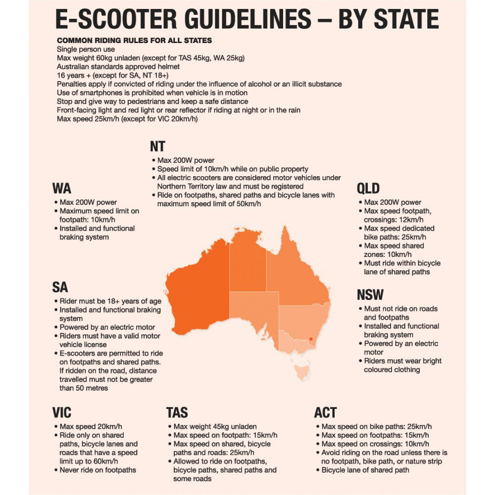 Australian states and territories have specific rules around electric mobility vehicles (e-scooters). Please view these guidelines on the packaging. This e-scooter should not be ridden on roads (shared with motor vehicles), footpaths (unless approved), skate parks, dirt roads, gravel, grass, or any other surface that is not smooth pavement (like a bike path).