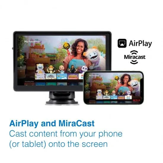 - Airplay and Miracast... cast content from your phone (or tablet) onto the screen... so now the kids can watch what's on your phone (or tablet)... even if the car is moving. Although this feature is restricted to new vehicles with built-in CarPlay/Android Auto... Airplay and Miracast are available on our device. A great tip is to hand the device to the kids in the back to keep them entertained.