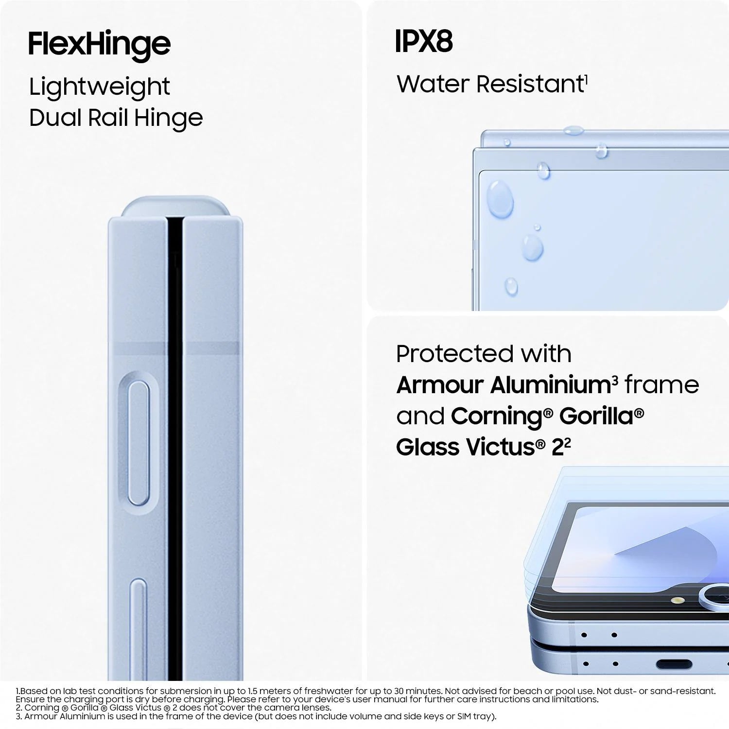 Don’t be fooled by the elegantly slim floating design, Galaxy Z Flip6 is built tough. Built with armour aluminium casing9, upgraded Gorilla Glass Victus 28, and a dual rail hinge to provide protection from bumps and accidental scratches, and shoulder life’s little accidents.